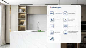 Features – It’s Made of Quartz, is hygienic and eco-friendly, No more Scratches, Easy to clear, Resistant to acids and alkalis, and Creates splendid style and designs.