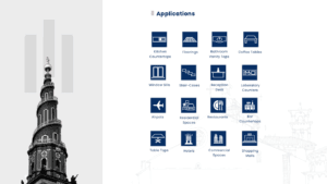 Internal Flooring, Internal Raised Flooring, Interior Cladding, Vanity tops, Kitchen Counter Tops, Staircase, Door Jambs/Door thresholds/Window Sills, Bathroom Vanities, Flooring, Wall Cladding, Backsplashes, Fireplace Surrounds, Tabletops and Worktops, Reception Counters and many more.